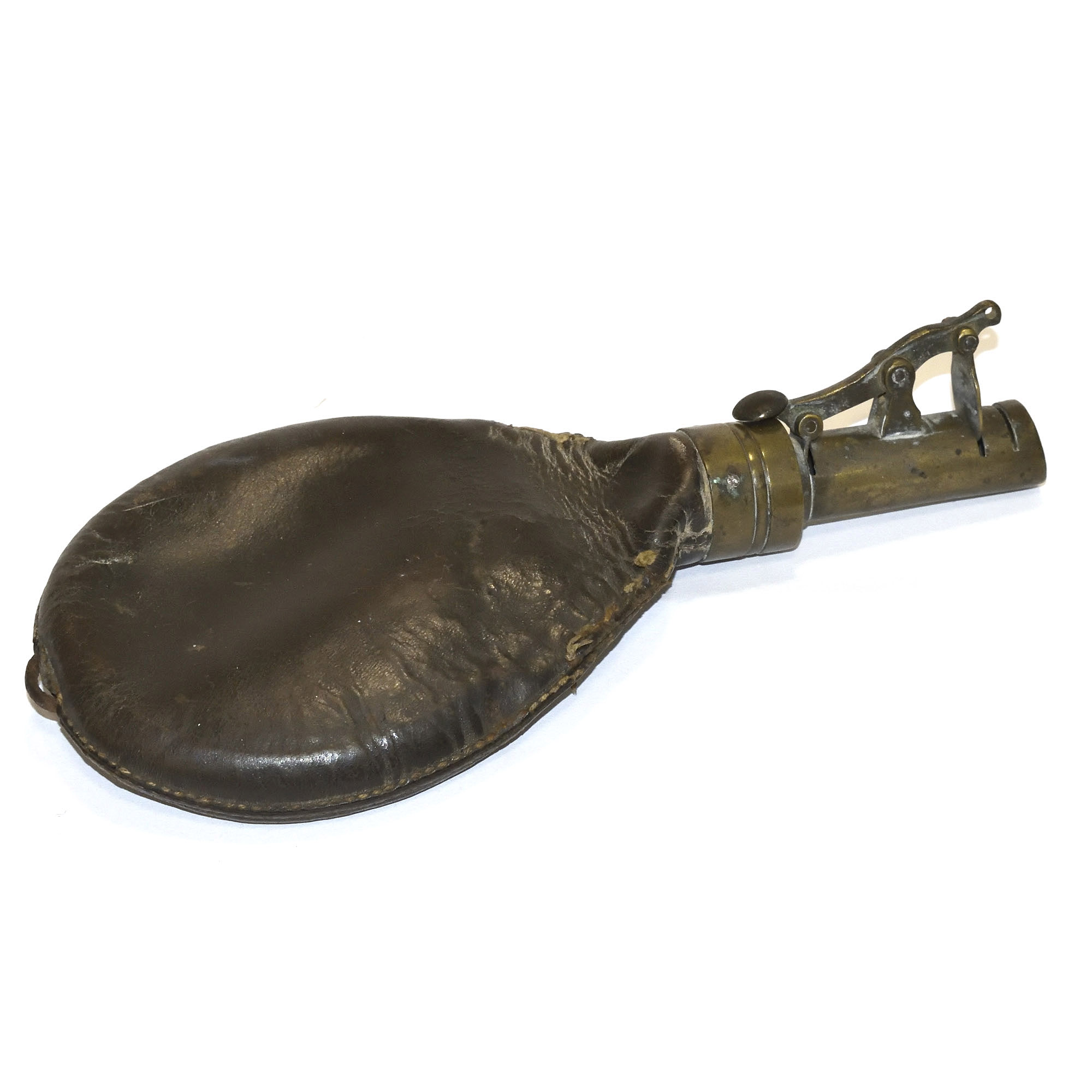 Plain leather and brass shot flask. Early 19th century. Return to Collection page