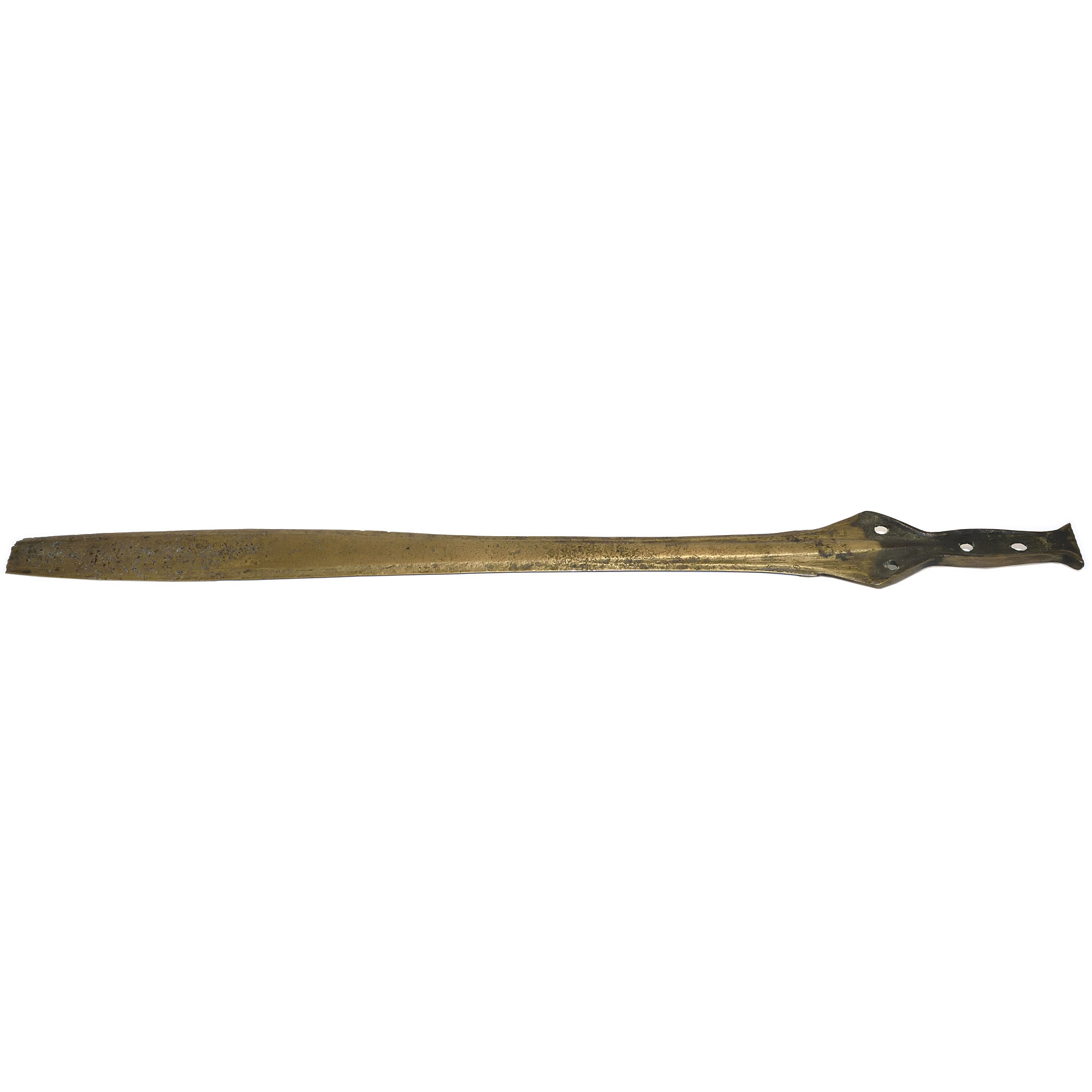 Bronze Age Sword. Late Bronze Age. Bronze V-type sword, tip missing, with narrow blade and hilt and sloping shoulders with 2 holes in the shoulders and 2 in the hilt for attachment of horn or bone plates to act as a grip. Black patina on hilt only, blade clean. Ewart Park type - Northern step 2. Found in Banffshire.