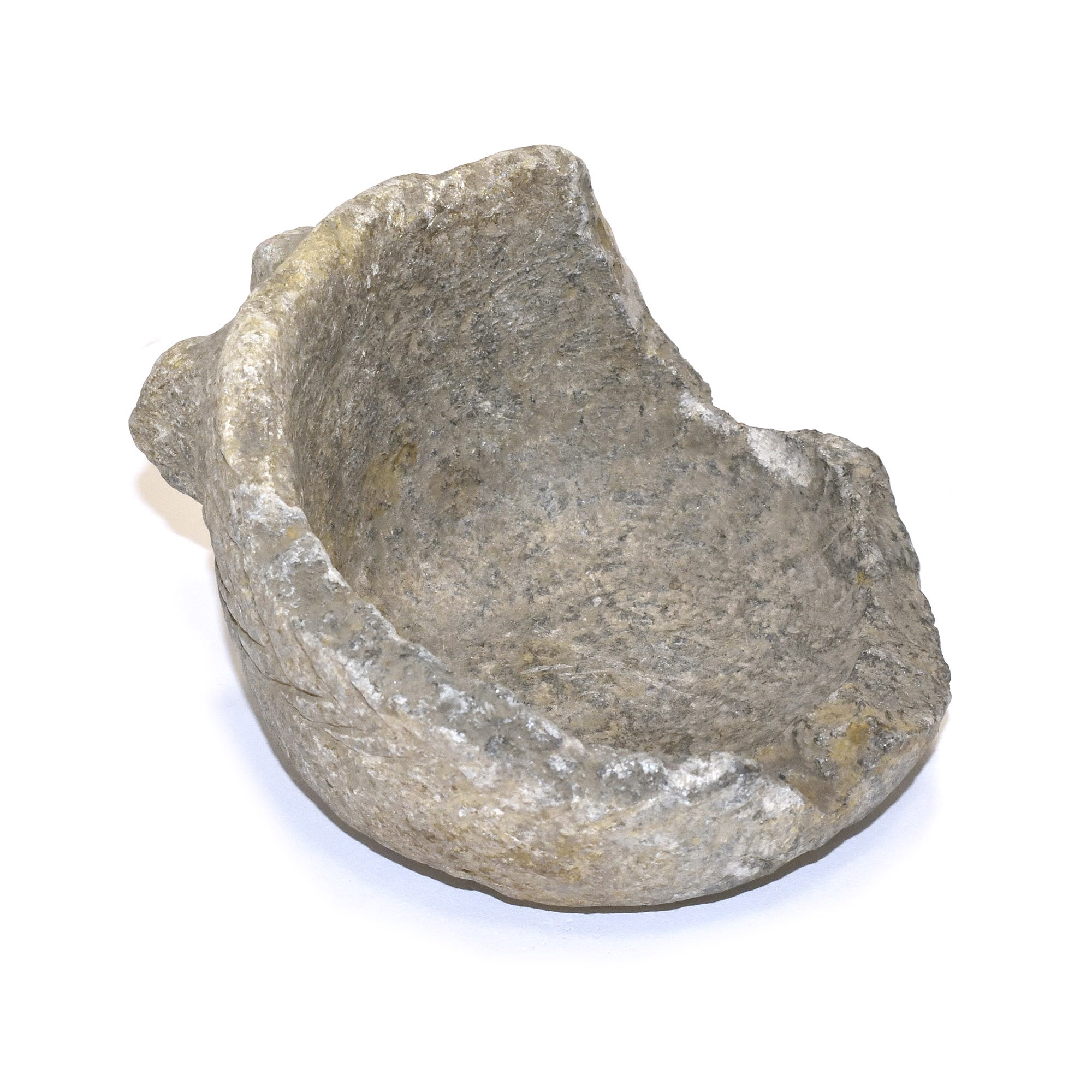 Broken Carved Stone Cup. Late Bronze Age.Carved stone cup, broken, with broken handle. Herringbone pattern on sides.